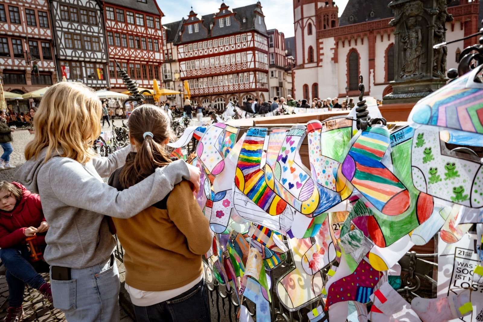 Am Freitag den 13.03.2026 hing auf dem Frankfurter Römerberg eine über 150 Meter lange Kette aus bunten Socken. Mehr als 1000 Socken, bemalt, gestaltet, aufgehängt von Kindern, Familien und Unterstützer.